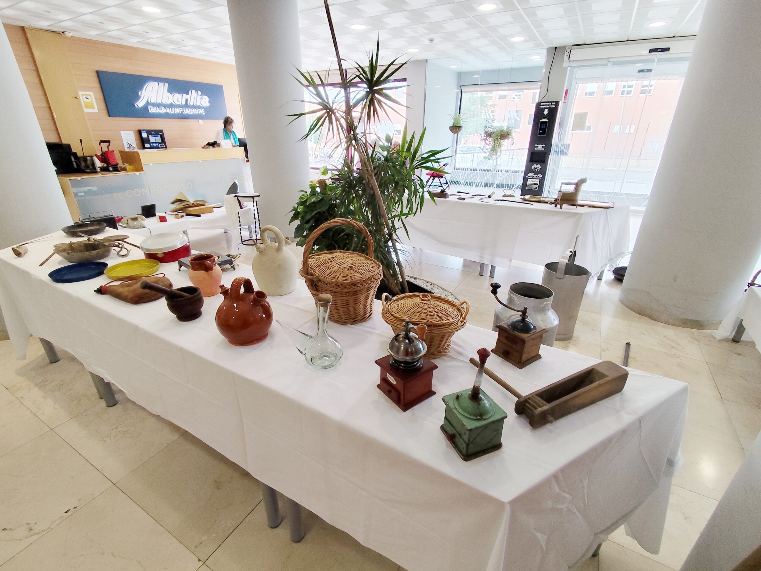 Por este motivo, se ha organizado una Exposición de Objetos Antiguos en el hall de la residencia. La exposición incluye instrumentos necesarios en actividades instrumentales de la vida diaria, como por ejemplo: antiguas planchas de carbón para planchar la ropa, molinillos de café, teléfonos, balanzas y romanas, lecheras, tajuelas para lavar la ropa, braseros de cisco, etc. También se expusieron imágenes de actividades y trabajos antiguos de la época. Los artículos han sido facilitados al centro por trabajadores y familiares de los residentes.