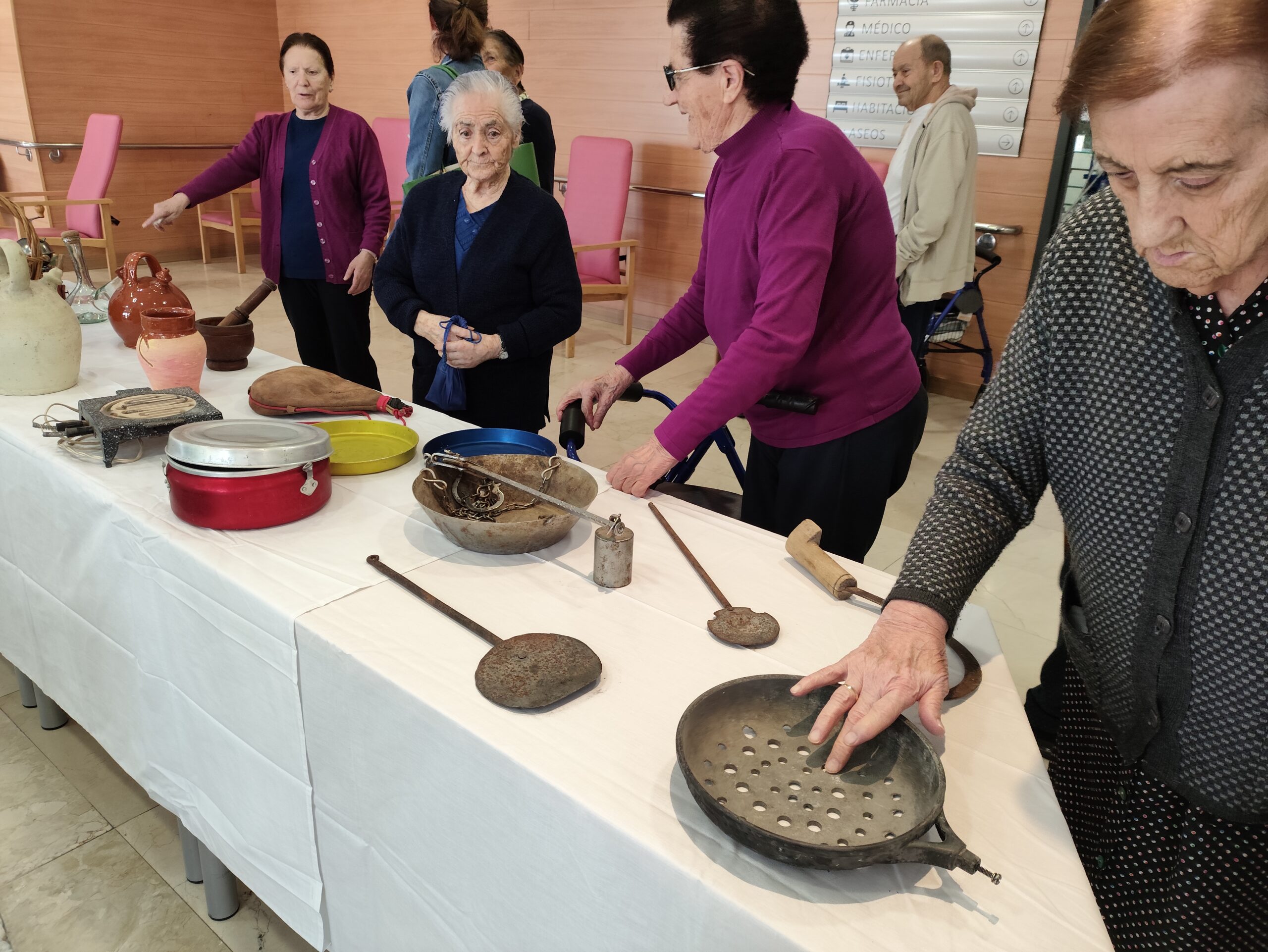 La curiosidad ha llevado a los residentes a acercarse a las mesas repletas de recuerdos. Cada objeto ha fomentado que los usuarios recuerden el día a día de su juventud, su modo de vida en el campo y las actividades que debían realizar. Esta actividad no solo estimula la memoria largo plazo de los usuarios, sino que también es una buena manera de trabajar funciones ejecutivas y actividades básicas de la vida diaria, ya que los residentes han compartido con los demás cómo se utilizaba cada objeto de la exposición.