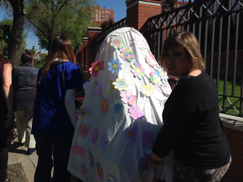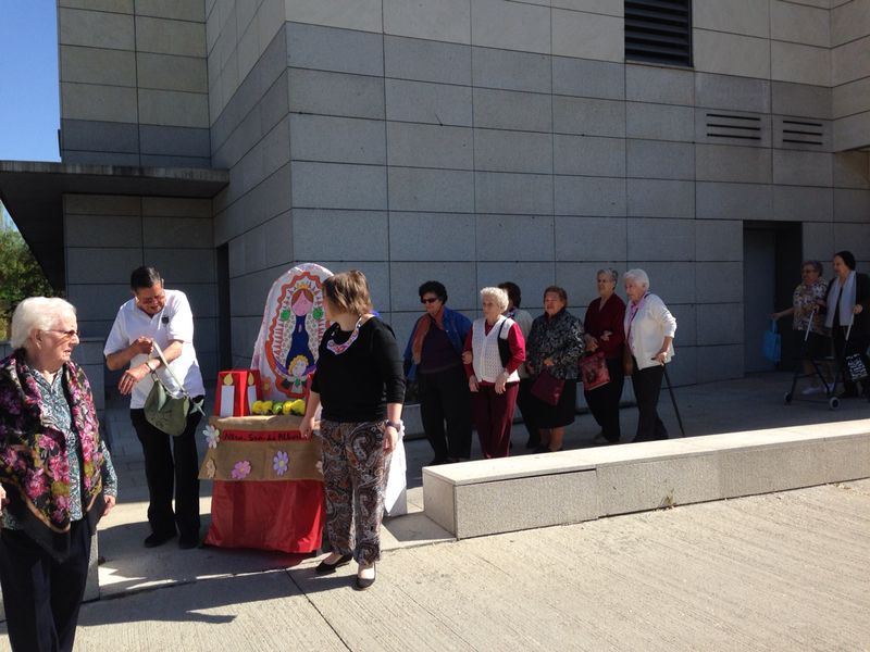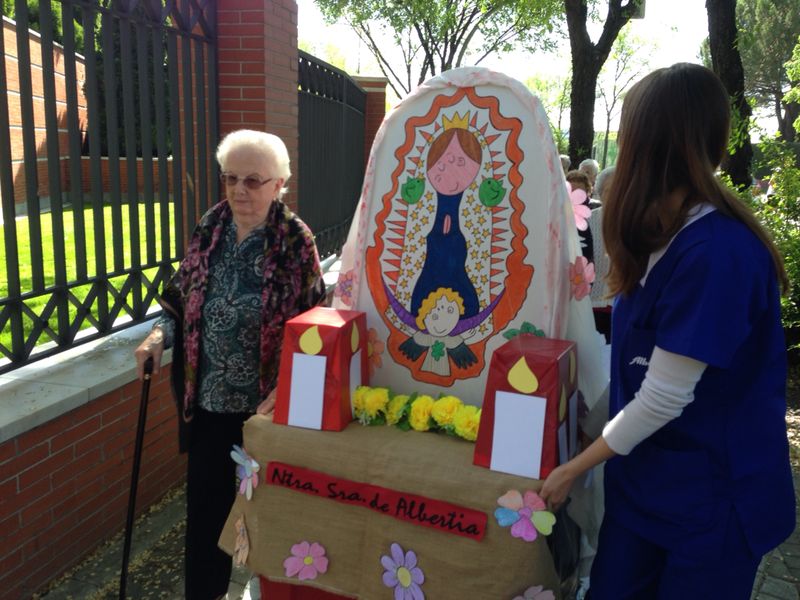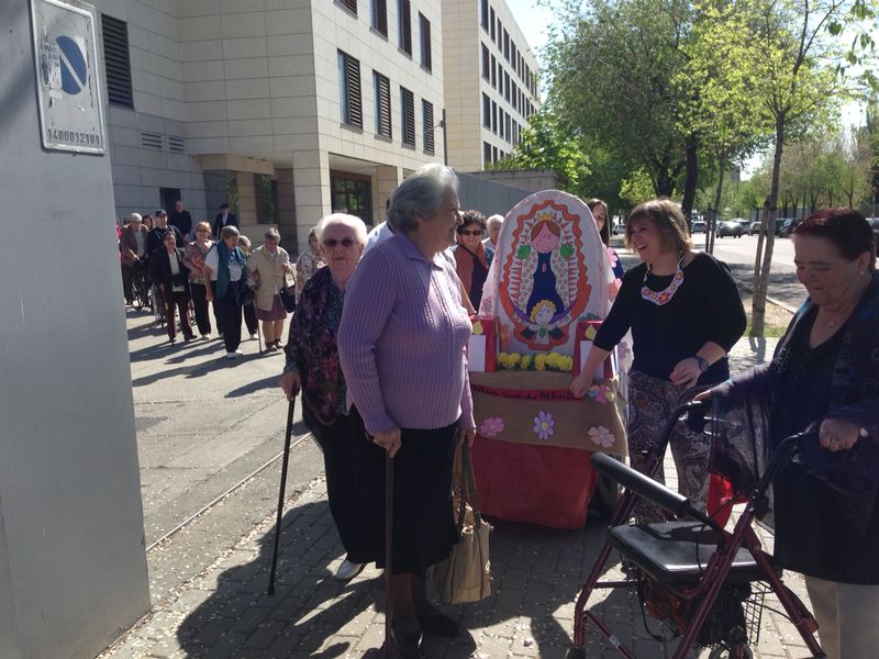 El miércoles 16 de Abril, Miércoles Santo, por segundo año consecutivo, quisimos sacar en procesión por el barrio a Nuestra Señora de Albertia. A las 11’30 h de la mañana salimos, con más de 30 “penitentes” entre residentes y familiares. Procesionamos haciendo la vuelta a la manzana de la residencia. La gente nos miraba sorprendida por la calle. Hicimos varias paradas para escuchar las saetas a cargo de nuestra querida Juana Bueno. Fue muy emocionante. Al despedirnos, todos pidieron a nuestra virgen poder repetir el próximo año, y con el mismo buen tiempo.