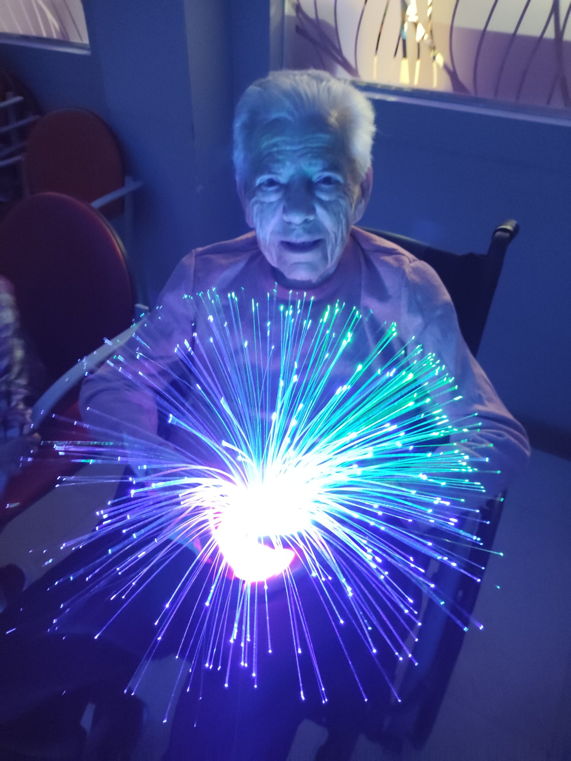 En la actividad se emplearon un proyector de luz con intensidad y colores regulables, así como lámparas de fibras ópticas. En la primera parte de la sesión, la psicóloga responsable optó por crear un ambiente relajante mediante música de fondo y observó en silencio cómo los residentes interactuaban de forma espontánea con los objetos luminosos, lo que permitió registrar una disminución en alteraciones conductuales, como la agitación.
