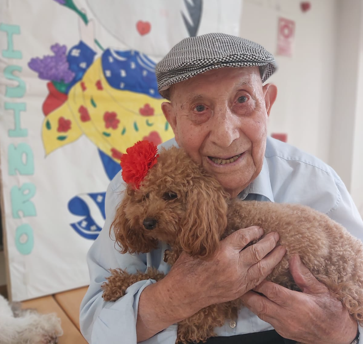 Dentro de las actividades que se desarrollaron para festejar el día de San Isidro destaca la elaboración de un photocall con los perros de la terapia asistida con animales, y el día 16 de mayo se organizó una celebración especial con José Luis, familiar de una residente que de forma voluntaria cantó varias melodías a los usuarios. La actuación se realizó en el hall de la residencia y participaron residentes, usuarios de centro de día y familiares. Todos ellos estuvieron acompañados del equipo profesional del departamento de fisioterapia, psicología y terapia ocupacional.