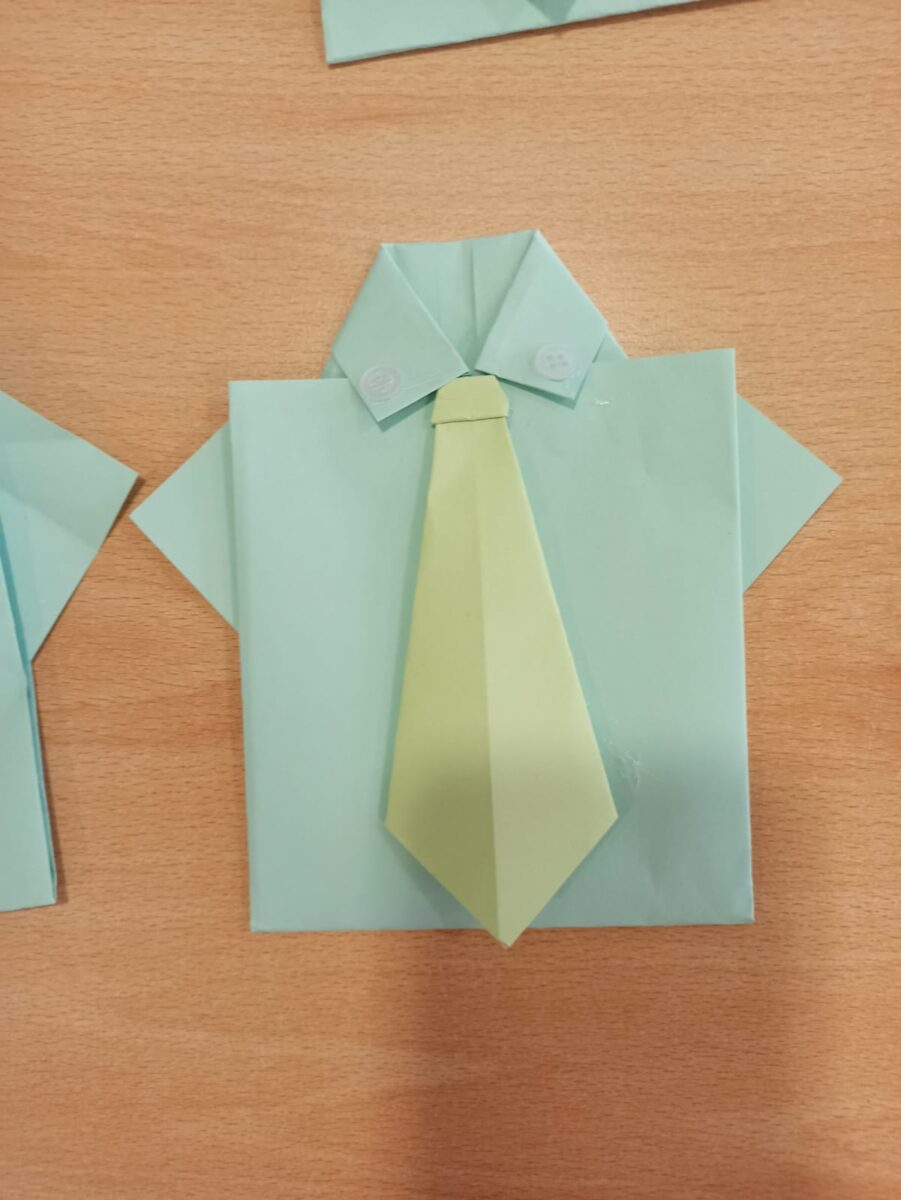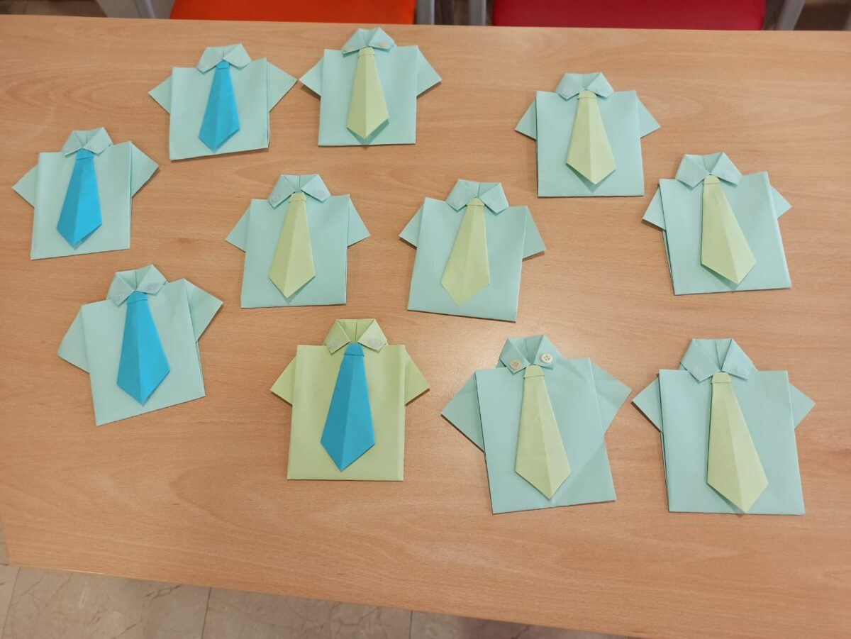 En este taller específico, los residentes debían de elaborar una camisa y una corbata con folios de papel de colores. La Terapeuta Ocupacional del centro daba las indicaciones pertinentes, así como los pasos a seguir a la hora de doblar el folio (ej, “doblar a la mitad, doblar desde la esquina derecha hasta la línea del medio”…etc). Si algún residente mostraba alguna dificultad, la persona encargada se acerca hasta él y le mostraba como hacer ese paso a través de un modelado desde su papel (ej. “mirar, tenéis que doblar por aquí el papel como estoy haciendo yo con el mío”). En general, no causo gran dificultad entre los usuarios al ser una figura sencilla a realizar.